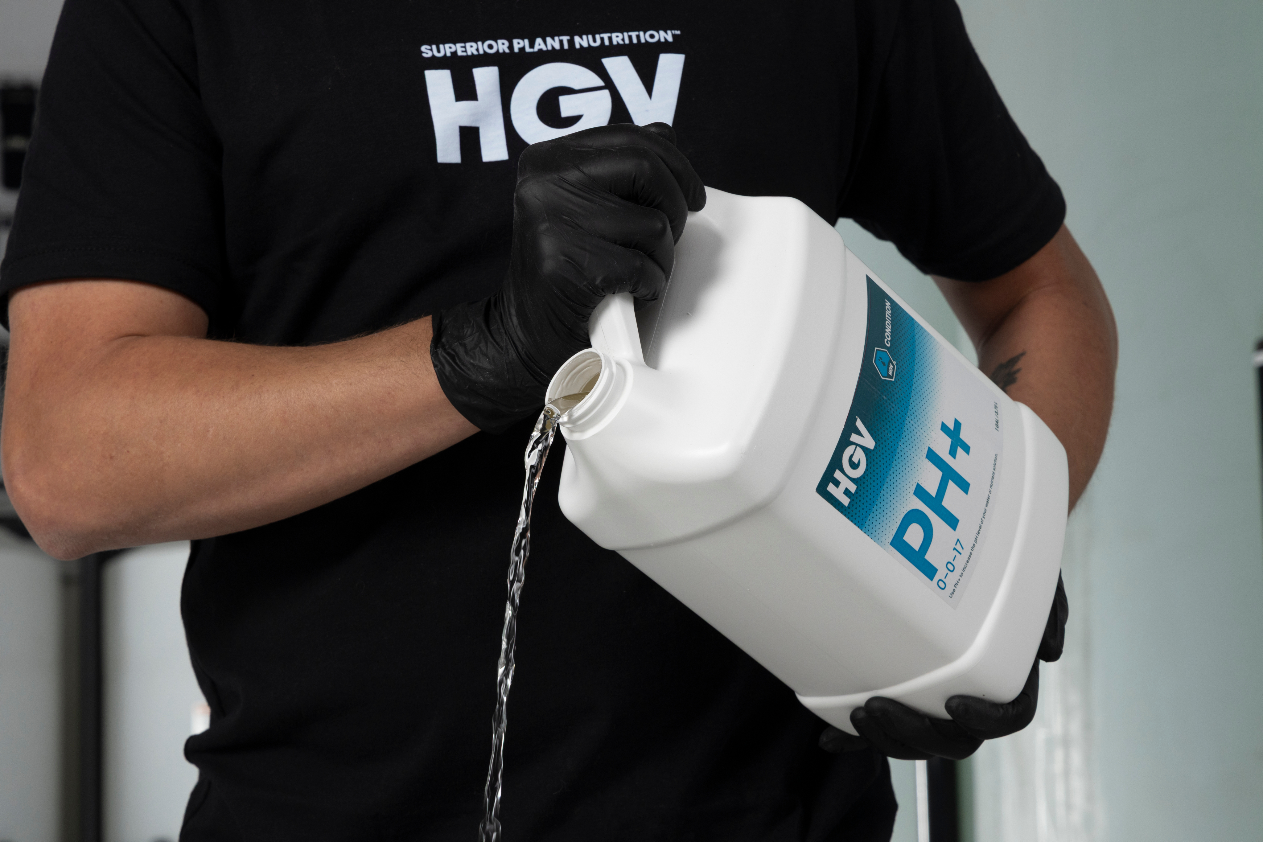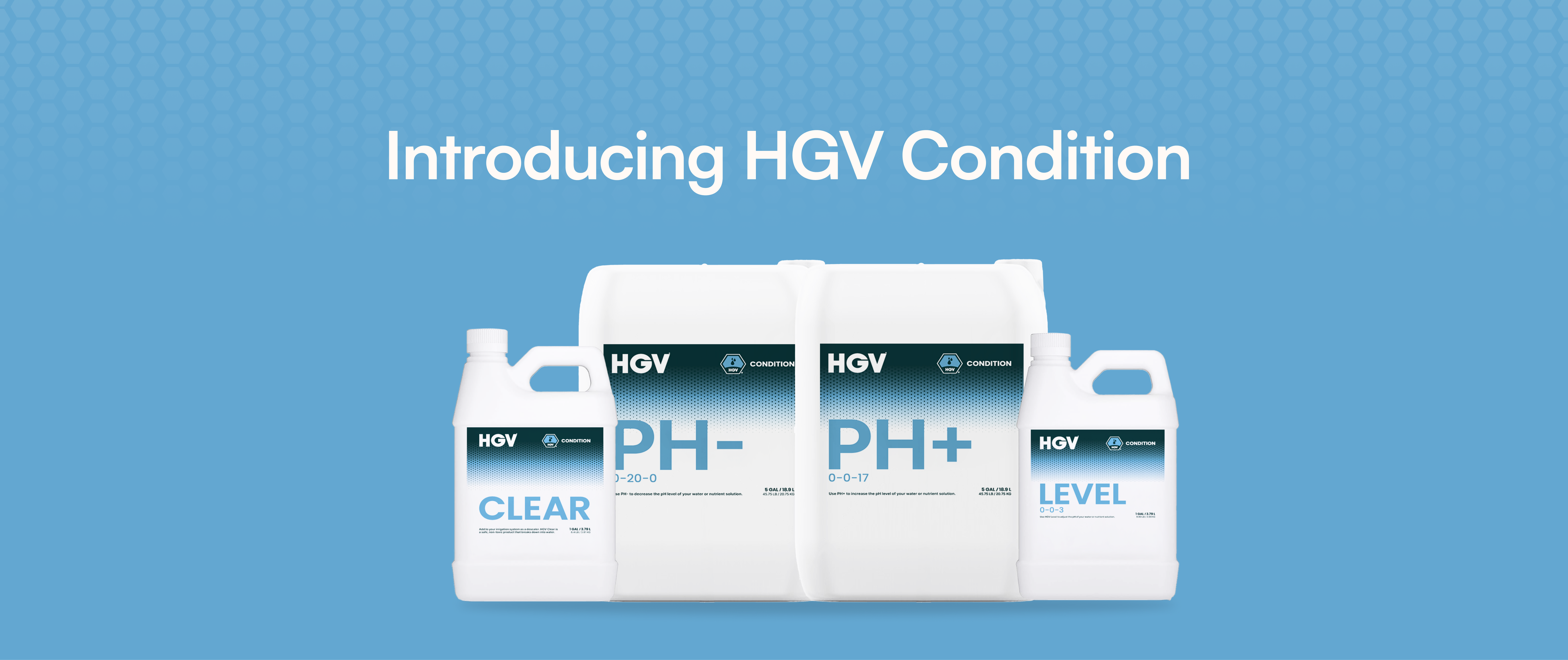The HGV Condition Line includes four products: pH Up and pH Down for precise pH control, HGV Level to stabilize pH, strengthen plants, and improve stress resistance, and HGV Clear to maintain clean irrigation systems and healthy root zones. All are optimized for compatibility with HGV to ensure consistent performance and maximum nutrient uptake.