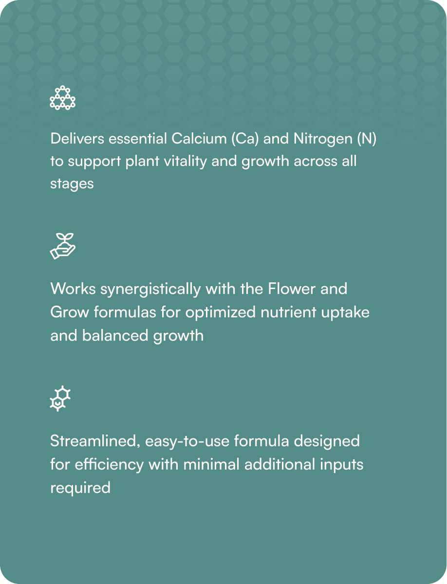 Delivers essential Calcium (Ca) and Nitrogen (N) to support plant vitality and growth across all stages