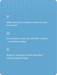 Its 20% concentration allows for precise and effective pH reduction in nutrient solutions, helping maintain ideal pH levels for nutrient availability and plant uptake. Designed for direct use without dilution, this formulation integrates seamlessly into HGV feeding programs without causing unwanted nutrient interactions or precipitation when used as directed.