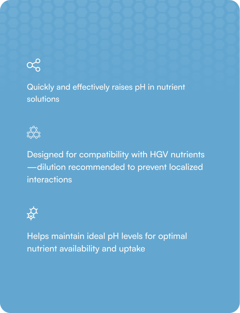 Designed to effectively raise the pH of nutrient solutions, it supports optimal nutrient availability and uptake across all growth stages. Due to its high reactivity, dilution prior to use is strongly recommended to minimize the risk of localized nutrient interactions or precipitation, particularly with calcium-containing inputs.